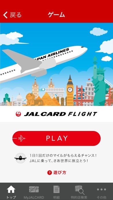 特約店のアプリ限定クーポンが手に入ったり、JALからのキャンペーン情報が手に入ります。また、アプリで1日1回マイルがもらえるチャンスゲームも付いているのでアプリを起動するだけでJALカードがお得に利用できます。