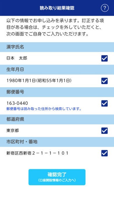 口座開設/届出(本人確認資料送信)では、必要事項の入力の必要はありますがスマートフォンだけでジャパンネット銀行の口座開設ができ、書類の郵送などの必要もありません。