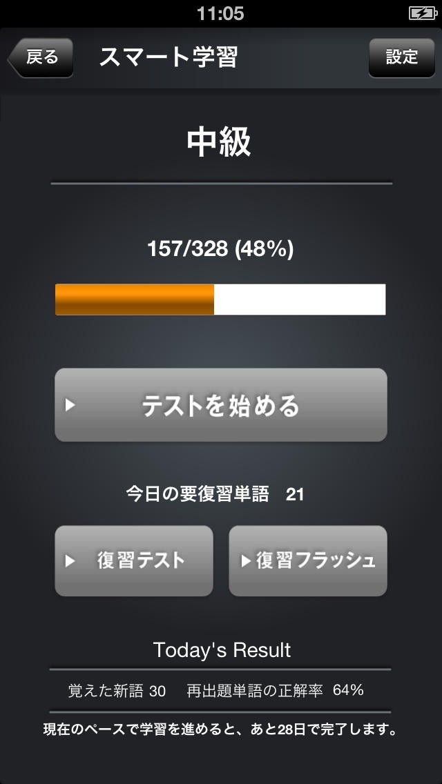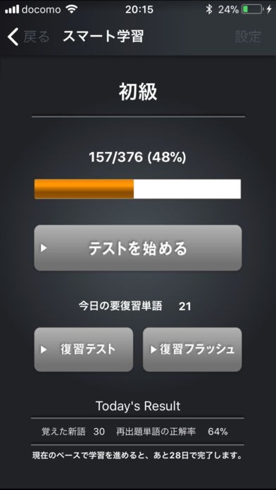 正解ペースを計測し、960全語句をすべて覚えきるまでの日数を表示します。