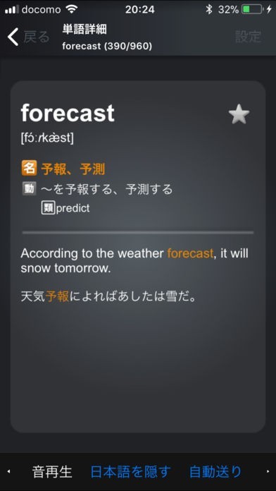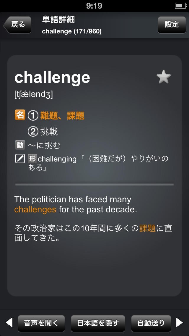 語句と例文の音声再生機能のほか、日本語部分を隠す学習機能も搭載しています。
