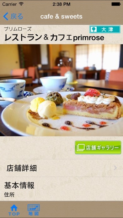 滋賀県にあるカフェ情報をご案内します。近江建物探訪と同様マップ機能があるので、隠れた名店へも気軽に足を運べます。店舗写真が並ぶギャラリーやお店の人からのメッセージを読んで、お気に入りのお店を見つけてください!