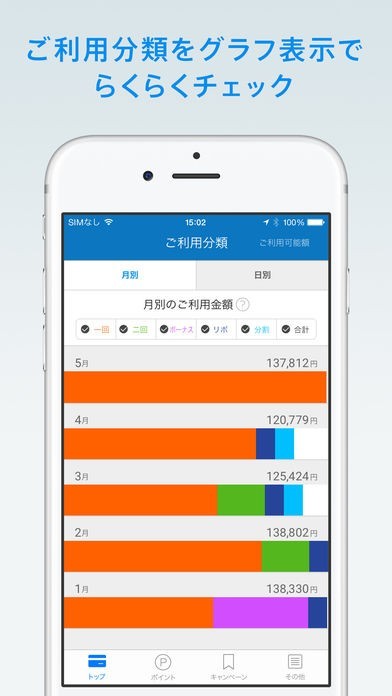 これまでの買い物で利用した金額を支払方法別に色をつけてグラフにしてくれるので、どのような使い方をしているかが簡単に把握できます。グラフの表示は月別と日別を切り替えることもできます。