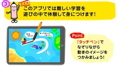 ステージ構成されたゲーム要素の高い仕様でひらがなを学習、お手本に沿って文字をなぞりイメージでひらがなを楽しく学ぶのに最適