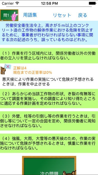 自動で間違えた問題を記憶し、間違えた問題、まだ解いていない問題を優先的に出題します。またセーブ機能がついているため、途中でやめても再度立ち上げた時に続きから問題を解くことができるので、効率よく勉強をすすめることができます(データは各科目ごとにmenuボタンからリセットすることができます)