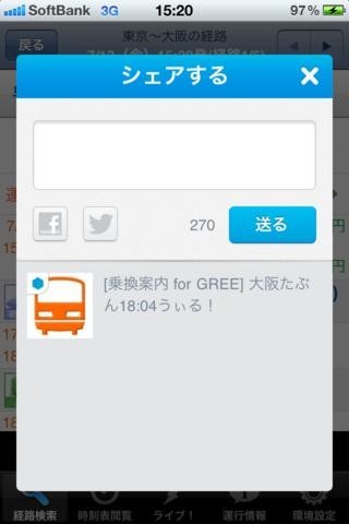 待ち合わせをしている時に、友人に到着時間を知らせたい場面に出くわすことは多々あると思います。この「乗換案内 for GREE」は乗換案内とメールが一緒に送れるように作られています。出発地点と目的地を入力すると、経路や運賃情報が出てきます。経路が出ると、あとはGREEを使って「ひとこと」機能で相手にメールを送れます。他にも各駅の時刻表も簡単に見ることができるので、電車ユーザーには便利でしょう。履歴も残るので、毎日使う時でもさっと検索できます。