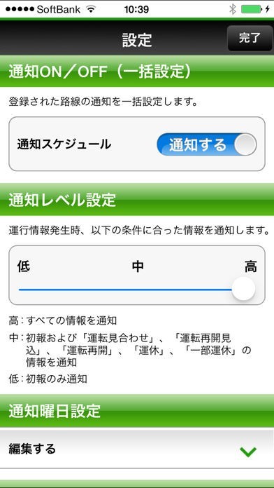 遅延情報や運転見合わせ等レベルごとにプッシュ通知のオンオフ切り替え可能です