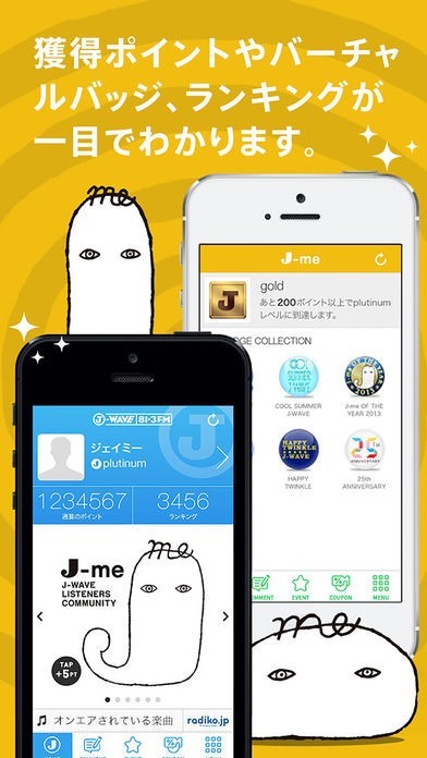 無料会員サービス「J-me」の会員専用アプリとして、ここだけのお得な情報をチェックしたり、特別なボーナスポイントを獲得することができます。オンエア中の楽曲をリアルタイムで確認できるのも特徴です。