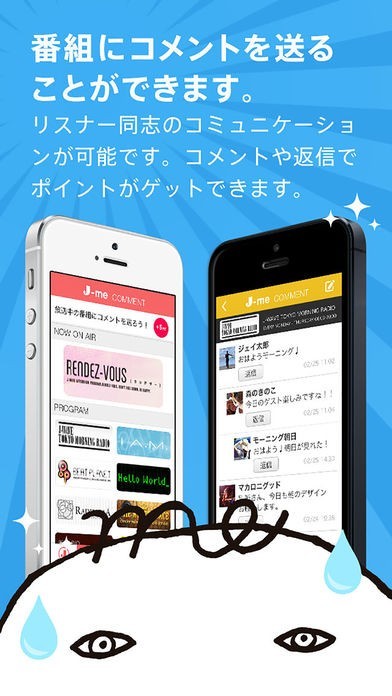 「J-meアプリ」は、ラジオ局「J-WAVE 81.3FM」が運営する無料会員サービス「J-me」の会員専用アプリです。 会員限定コンテンツとして、最新ニュースやお得な情報、イベント情報などの配信を行っています。 アプリを起動することで1日1回ボーナスポイントを獲得可能。 オンエア中の楽曲のリアルタイム表示機能や、会員ランクによってアプリの色が変化するカラーチェンジなどを用意しています。