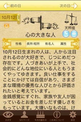 .各誕生日の特徴をtwitterやメールで友達に教えることができる引用機能付き。