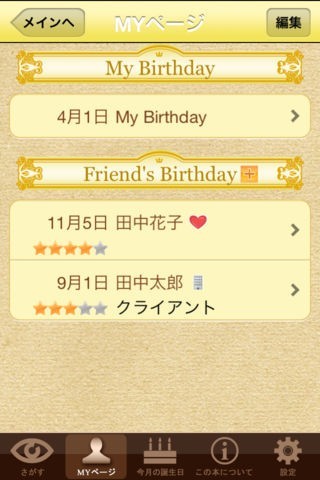 .パスワードロック機能付きのMyページには、自分や友達、恋人の誕生日を登録でき、かつ自分なりのメモを追記できる。