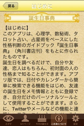 当たりすぎて怖い、と評判になった大ベストセラー書籍『誕生日事典』(発行:角川書店)を元に、アプリならではの機能を追加しています。
