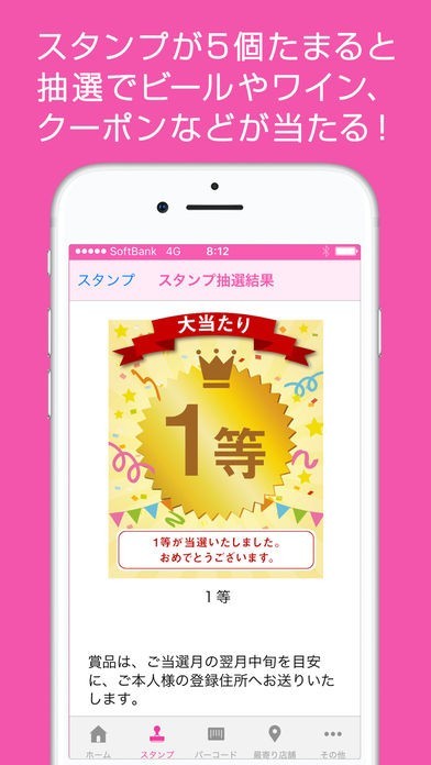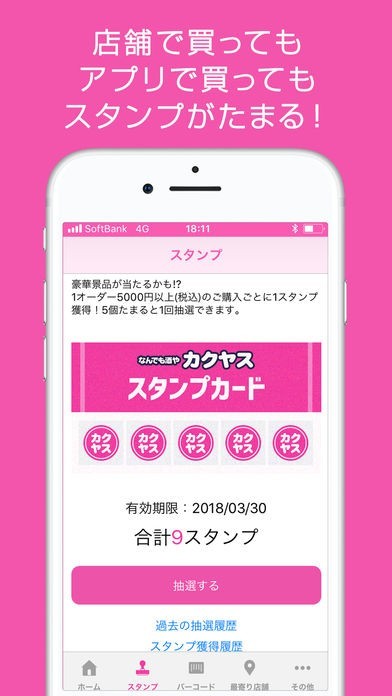カクヤスの実店舗でも2500円以上で専用のバーコードが発行され、それをアプリでスキャンすることでスタンプを貯めることができます。スタンプは5つで商品やクーポンの当たるルーレットに挑戦できます!毎日の買い物が少しだけ楽しくなりますね!