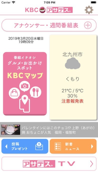 KBC九州朝日放送がお送りする「アサデス。」を中心にした情報を詰め込んだコミュニケーションアプリです。