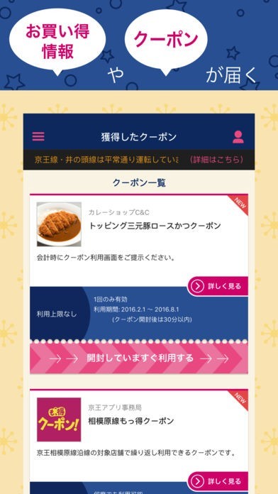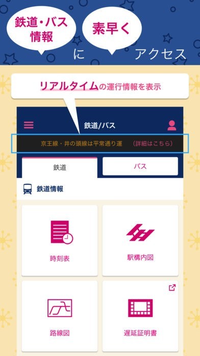 リアルタイムの運行情報を知ることが出来ることから、大雨や強風などの場合にちゃんと電車に乗ることが出来るのかを知ることが出来、タクシーやバスなどを利用したほうがいいのかを確認することが出来ます。 また、もし遅れが発生した場合にはアプリ内の「遅刻証明書」機能を使えば簡単にそれを発行することが出来るので、仕事場や大学に提出することによって怒られたりすることはなくなるでしょう。 また、近隣の施設のクーポンを獲得することが出来るので、それをきっかけに食べ物を低価格で食べたりサービスを受けたりといったこともできます。 さらには、スタンプラリーを利用できて楽しく電車に乗ることも出来ます。