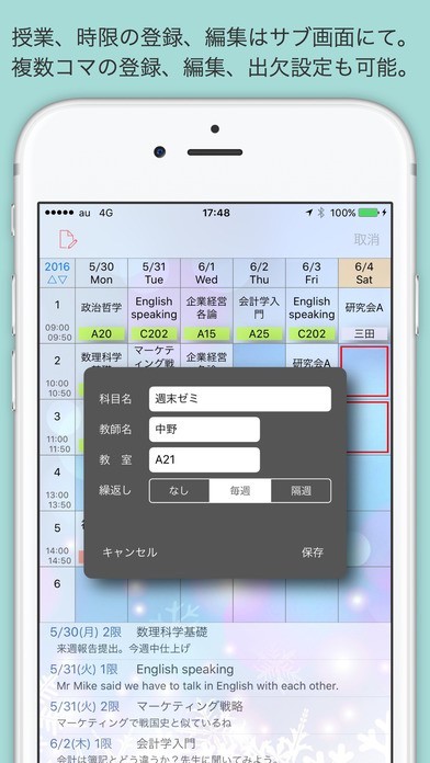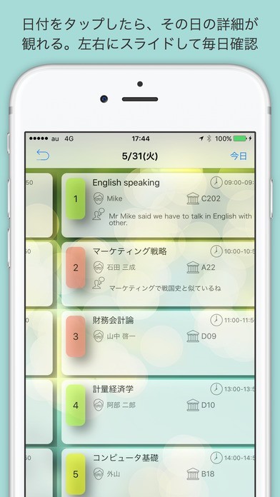 ・毎日最大12コマの授業科目情報を登録できます。左右スワイプするとその前後週の情報を確認できます。