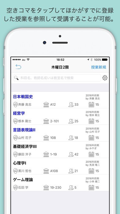 ・授業セルにタップすれば、同じ学校(学部)の既に登録済みの授業を検索してコピー(受講)することができます。