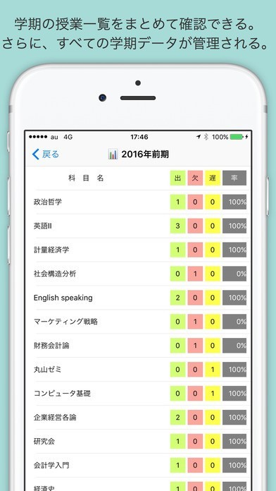 普通の時間割と違って、1週間或いはA週B週の時間割を記録するだけではなく、究極の時間割が学期期間中の毎日をすべて自由に設定できるアプリです。直感的な登録方法の工夫により普通の時間割と変わらないぐらいの手間で週間或いは隔週の繰り返し授業を登録できます。毎日の出欠状況、授業のメモ・課題、テストなどを記入ができて、週間と日次画面にて確認できます。最後、学期ごとに授業の出欠状況が自動的に集計されます。