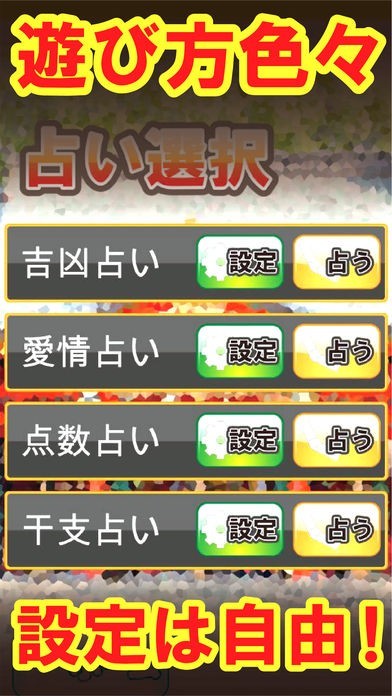 占いごとに自由に設定ができるので、色々な使い方、遊び方をすることができます。
