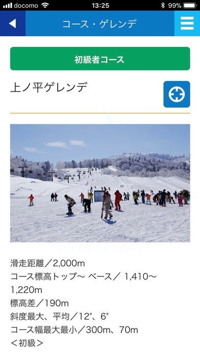 コース・リフト・レストラン・温泉(外湯)などの情報が閲覧できるのはもちろん、GPS現在地情報を利用して周辺の施設を検索することもできます。