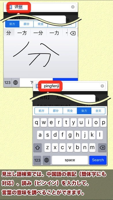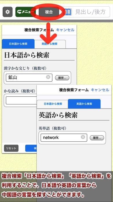・複合検索:日本語検索では、漢字かな交じり・かな読み双方から、中国語を検索可能。英語検索では、対応する英単語から、中国語を検索することができます。