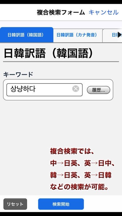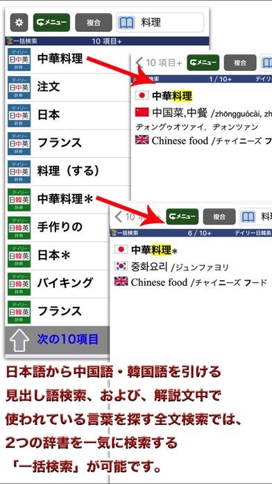 日中英、日韓英の2種類の辞書を同時検索することができます。また、前方/後方/部分/完全一致などの検索ができるため、知りたい情報を辞書の中から簡単に見つけ出すことができます。