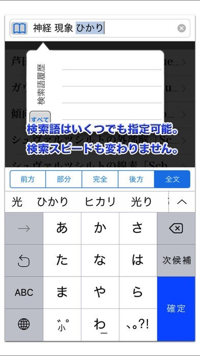 思いついたらすぐに検索開始。「全文検索」のほか、「見出し語検索」も前方/後方/部分/完全一致と多角的な検索が可能です。