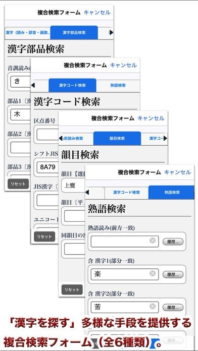 「前方一致」から「全文検索」まで、幅広い検索機能が付いていることで、自分が一番探しやすい方法でワードを探し出す事が出来ます。また、「韻目検索」も行えるため、同じ韻目の漢字も探しやすくなっています。