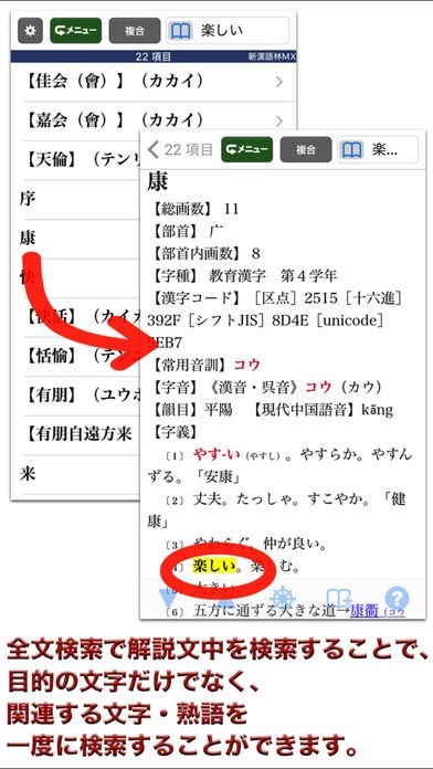漢字の解説文中を全文検索するとその漢字に関連した漢字や熟語をまとめて検索することができるので、一語一語を検索する手間をかけることなく一度に多くの知識を得ることができます。