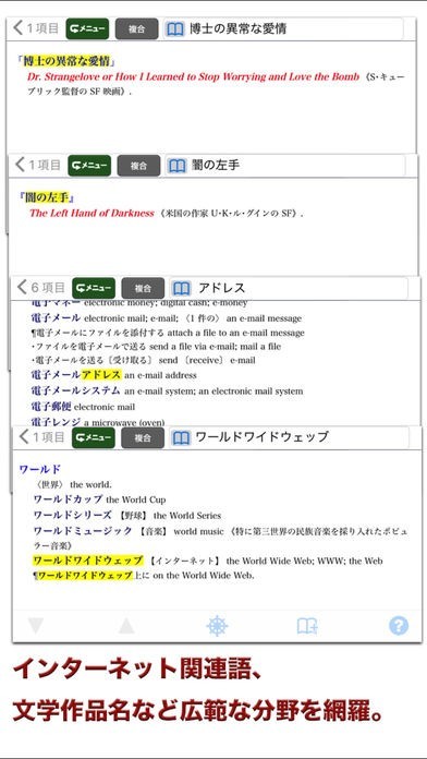 例えば山というワードで検索を行った場合は見出し語に山を含んでいる単語すべてを見つけることができます。特定の言葉一つを見つける場合とは違って関連する項目を学べる機能です。