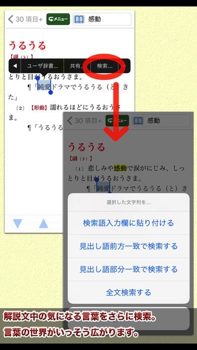 解説文の中に意味の分からない言葉や気になる言葉があれば、なぞるだけですぐに検索できます。いちいち検索窓に入力する必要がないので、簡単に連続して言葉を調べることができます。