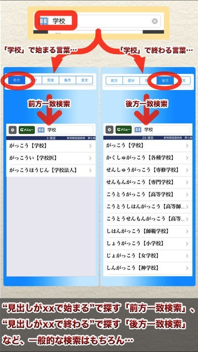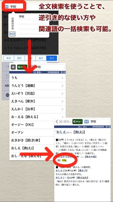 このアプリでは「全文検索」はもちろん、「見出し語検索」や「前方、後方、部分検索」、さらには「完全一致検索」も可能となっています。紙媒体では不可能な検索機能を駆使すれば、時間を有効に使うことができます。