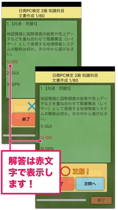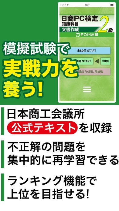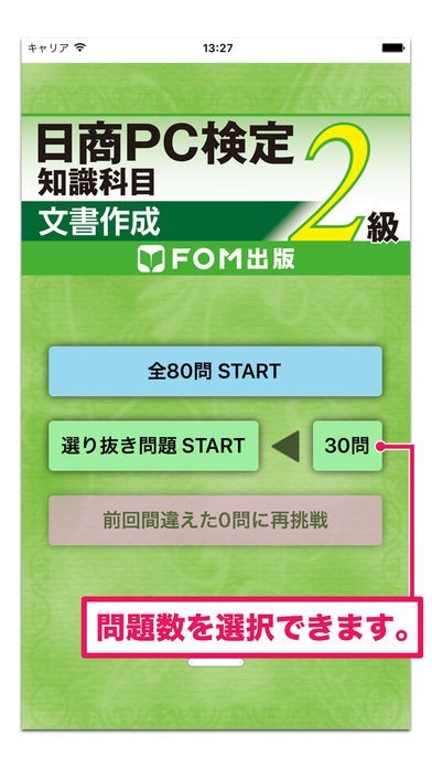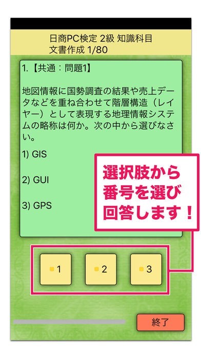 共通分野と文書作成分野の2種類を学習することができます。2種類の分野の合計問題数は80問で、問題は繰り返し学習することができます。外出時の空き時間にコツコツ試験対策するのにオススメです。
