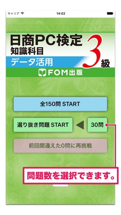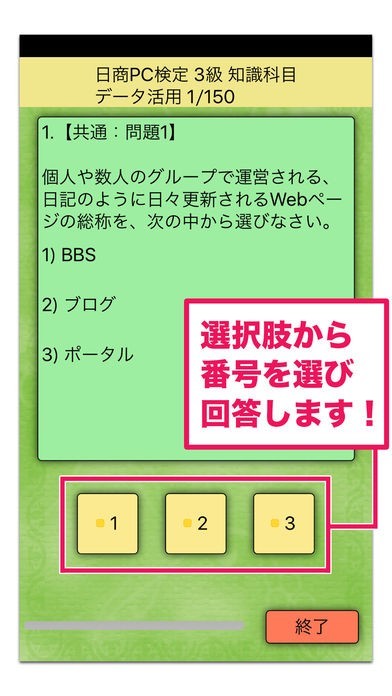 公式の問題集に掲載されている問題から、共通分野100問とデータ活用分野50問の全部で150問を収録しています。クイズ形式でサクサク解答していけるので楽しみながら学習を進めることができます。