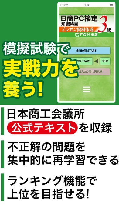 日商PC検定3級アプリは、楽しくクイズで遊びながら資格試験の勉強ができます。 問題は公式の日商書籍から出題されていますので安心です。知識科目分野、プレゼン資料作成分野の両方をクイズ形式で学べます。繰り返し遊ぶことで合格を目指しましょう。