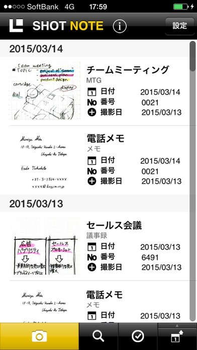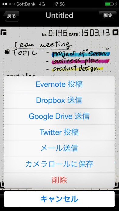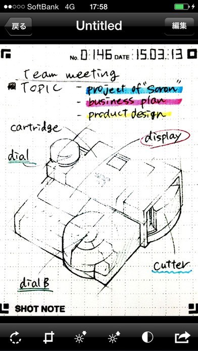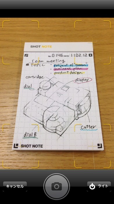 「SHOT NOTE」では、紙に書いたものを撮影してデジタル化することが出来ます。明るさを変えたりいろいろ設定をいじることによって、パソコンでも見やすいようにしてくれます。 撮影したものは、日付と番号と撮影日が記載されていて順番に並べられるので、後で見やすくなります。 また、右下のボタンから、ドロップボックス、エバーノート、ツイッターへそれぞれワンタップで送ることが出来るので、バックアップをとるというのも簡単に行なえます。
