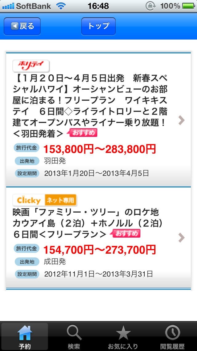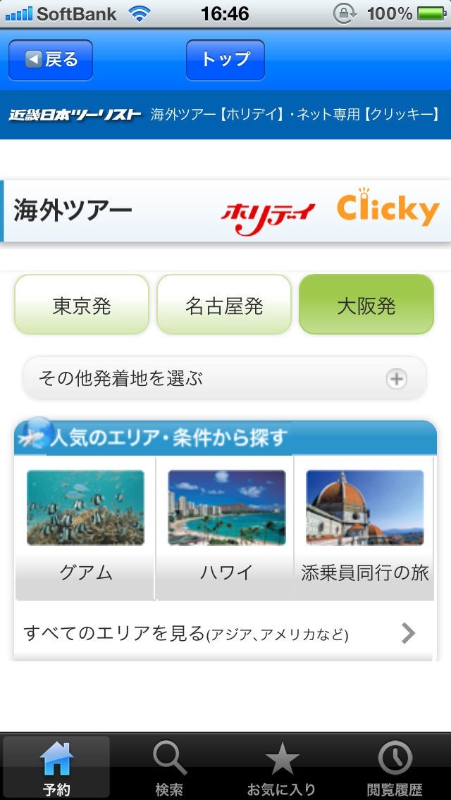 気になった行程やツアーはお気に入り登録することが可能です。お気に入りタブを押すことですぐに見返すことができます。また履歴機能もあるので、直近閲覧したものもチェックしやすいです。