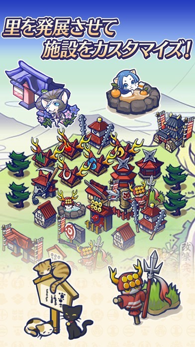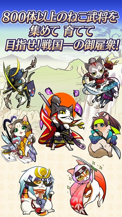 戦国武将対戦をゆるくて可愛いねこ武将で対戦できるゲームです。800体以上のねこ達が搭載されており、たくさん集めて育て戦国一の御雇衆と呼ばれる傭兵団を結成しましょう。ねこ武将達は、織田信長をモデルとした織田のぶニャが等実在の武将をモデルにしているので、通常の戦国武将対戦は怖くて苦手という方可愛く楽しく戦国ゲームを楽しむことができます。ねこ武将と得意技の組み合わせは、無限です。多彩な特技と戦術でライバル達と合戦で対戦しましょう。また、対戦ゲームと並行して自分の里を開拓し、新しい施設をどんどん作って里を発展させていくことが可能です。必殺技を習得するために火・地・風・水・空の五輪玉を集めて五輪奥義を開発しましょう。