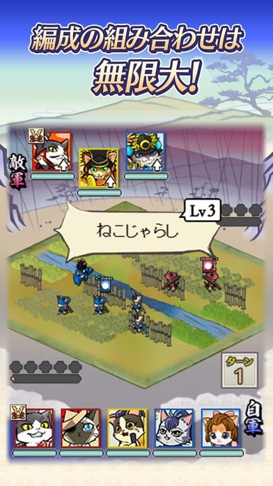 200種以上の豊富なねこ武将を収録、各々のねこ武将が持つ特技を組み合わせて行う戦略的な戦闘要素が魅力