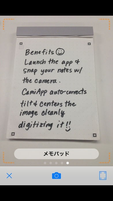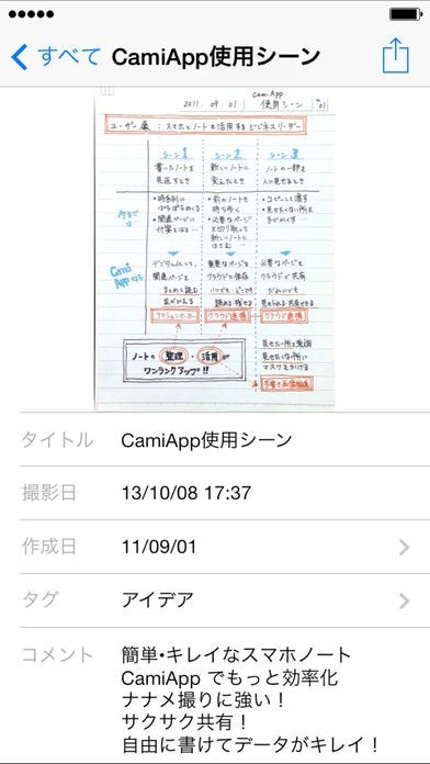 手書きのメモをデータ化したい!そんな時に便利な『CamiApp』は、手書きノートやメモのデータ化を手軽に行うことができます。 アプリからカメラを起動してノートを撮影するだけと、使い方は簡単。 自動的に歪みや傾きの補正を行い、スマートフォンで閲覧可能なデータとして残せるのが特徴です。 タイトルやタグ、コメントなども添付できる他、アクションマーカー機能によって指定したクラウドサービスへの自動バックアップが行えるのもこのアプリの便利なポイントでしょう。 大事なメモをいつも紛失してしまうという方は、メモのデータ化で整理整頓してみてはいかがでしょうか。