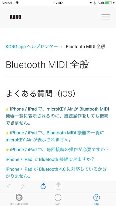 「Bluetooth MIDI」に対応している機器をアプリで利用することができるようになります。 設備費用はかかりますが、アプリ内はすべて無料で利用することができます。 「BLE-MIDI接続」をタップすれば対応するデバイスの一覧が表示されるので、そこから接続をすることによって機器を使用できるようになります。また、「Info」によって、アプリについての情報を見ることができるだけではなく、開いたりすることもできますし、公式Twitterや公式Facebookにもアクセスすることもできます。 そして、疑問点があれば、「よくある質問」から調べれば解決することができることでしょう。