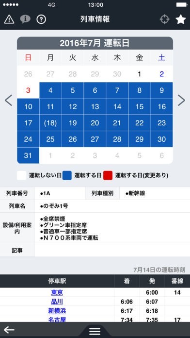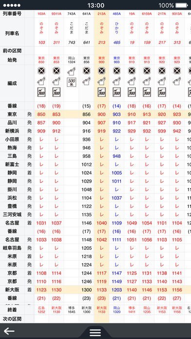 電車の発車および到着時刻が確認できます。所要時間も一目で分かるので、旅行中の利用にも便利です。