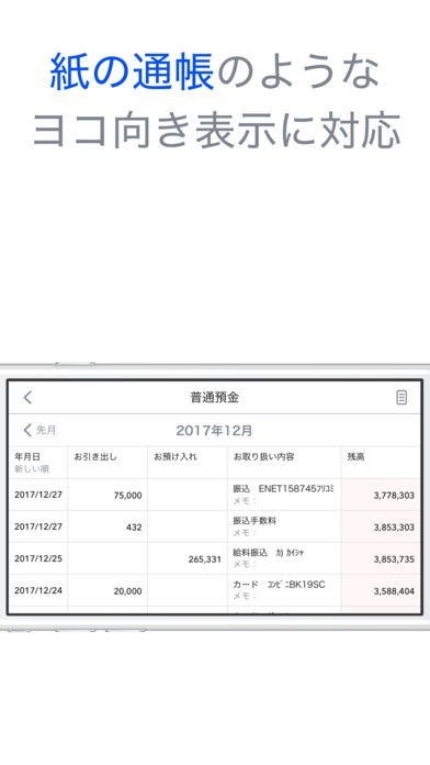 ・ヨコ向きの表示にも対応しているので、紙の通帳と同じ感覚で利用できます。