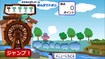 や~!ぼく「ピョンちゃん」。みんなにカエルとばしゲーム『田んぼでドボ~ン』にチャレンジしてもらうピョ~ン。回る水車の上から、田んぼにめがけてジャンプ!おっ、おっと、すべった!飛び込む田んぼによって点数が違うピョ~ン。みんながんばってくれピョ~ン!