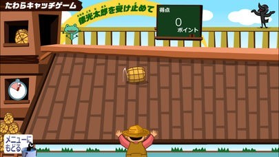 や~みんな!俵光太郎です!たわらキャッチゲーム『俵光太郎を受け止めて』は、納屋から転がってくる俵を「耕作どん」を使ってうまくキャッチするゲームなんだ。「ピョンちゃん」に触れると得点がマイナスされるから気をつけてくれ!制限時間は30秒だ。さて何個キャッチできるかな?「耕作どん」たのんだぞ~!