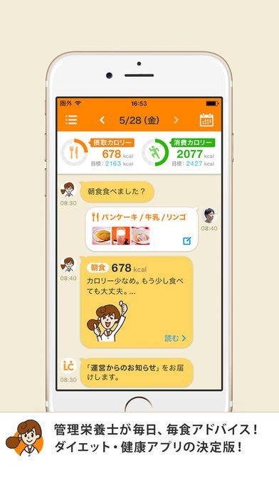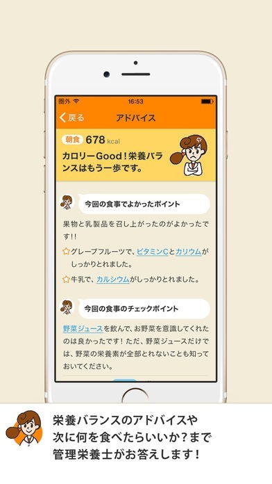 食事の記録に対して管理栄養士キャラクター「カロリーママ」がアドバイスをしてくれます。栄養バランスについての知識や、効果的な食事についての情報など、毎日の食事に生かせるアドバイスが満載です。