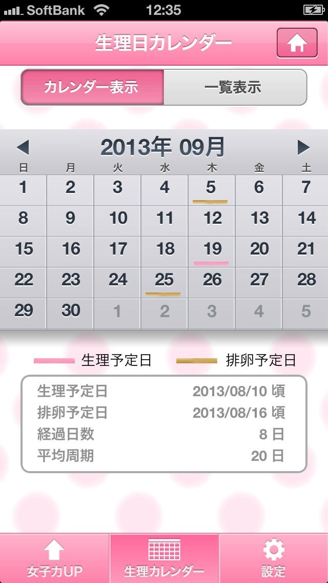 カレンダーに生理予定日や経過日数を登録する事が可能