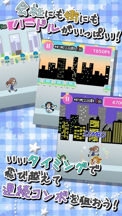 画面中央を走るOLの前に次々ハードルキャラクター達が現れます。