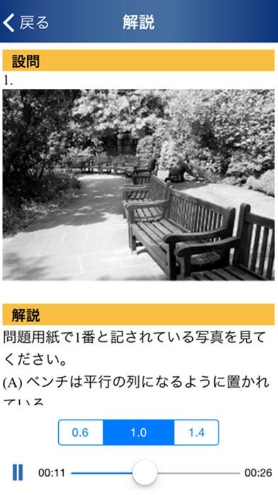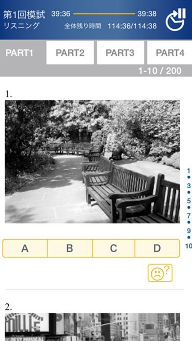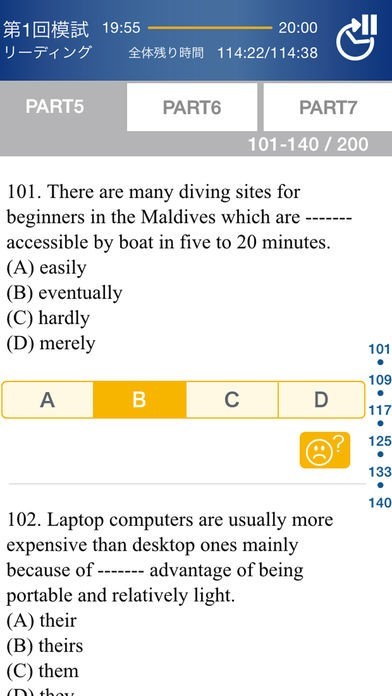 「Rep∞t」は、パートごとに分けて出題される模試機能を搭載。10000問以上の問題を解いていくことで、TOEICのスコアアップを目指すことができます。自分の学習レベルに合わせて問題を解きながら、苦手分野を徹底して克服できるのも嬉しいポイント。リスニングのスピード切り替え機能も併せて利用すれば、聞き取りにくい問題は音声スピードを緩めながら挑戦することもできます。実際のTOEICテストに合わせて時間設定ができる模試用タイマー機能も用意されており、テスト開始からの経過分数と残り時間を判りやすく表示可能。すべての問題を時間内に解くための感覚を掴むことができるでしょう。