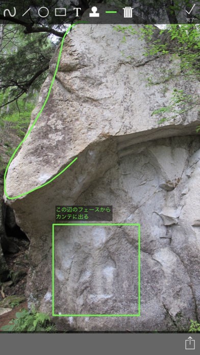 ロッククライマーが登っていいとされている一枚岩の写真をとって、ゴルフの解説のように、写真の上から書いてコースどりを考えて、本番に成功するようにすることができます。