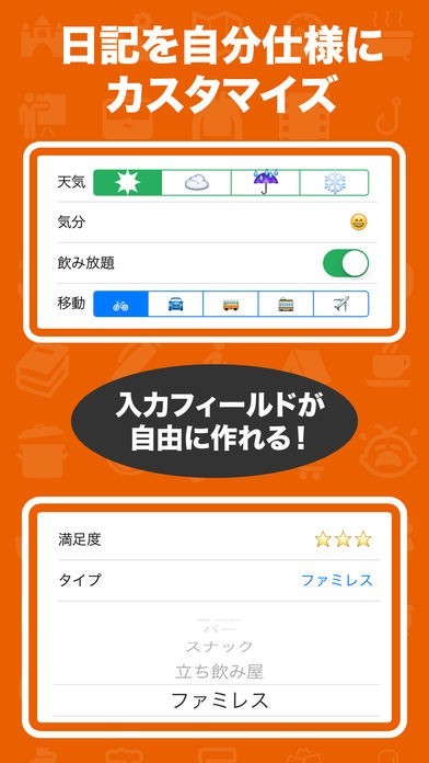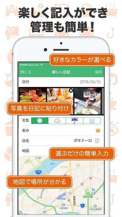 日記の記録はフォーマットに入力するだけなので、簡単に日記を続けることができます。趣味やライフスタイルに合わせて最適なフォーマットが用意されています。写真や地図もタップするだけで簡単に貼付できます。
